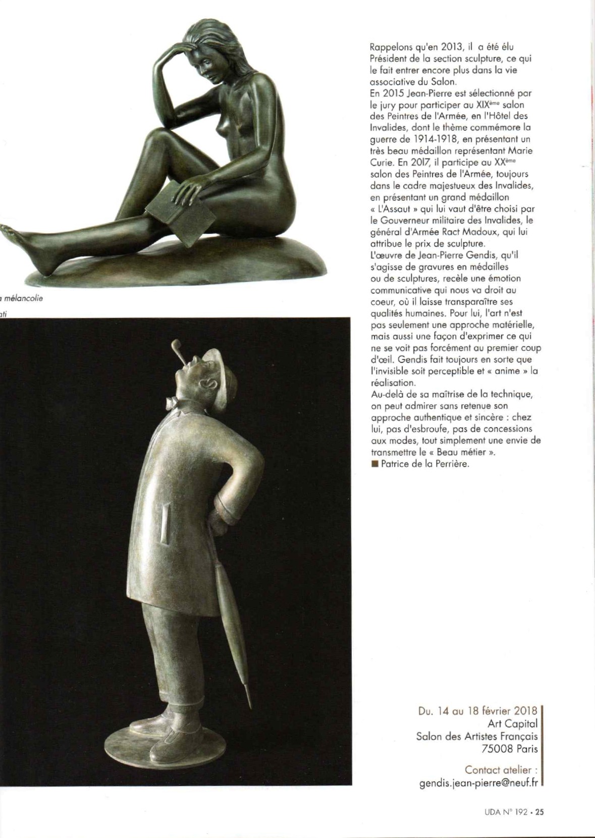 Toujours intéressé par les défis, Jean Pierre GENDIS qui depuis longtemps pratique la sculpture a décidé de passer le pas et de présenter ses œuvres toujours au Salon des Artistes Français.